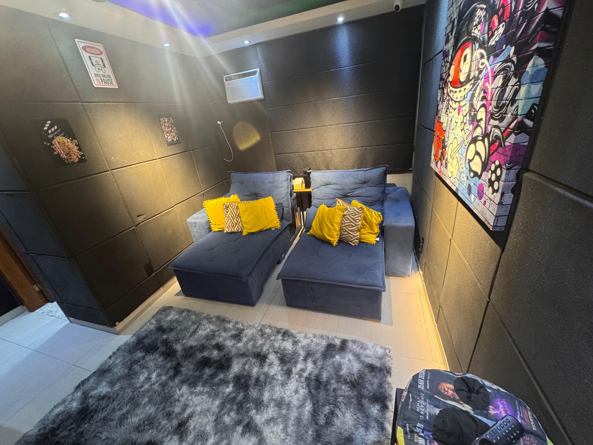Totalmente projetado com isolamento acústico, iluminação cênica, poltronas reclináveis e decoração estilosa. Um verdadeiro cinema em casa.