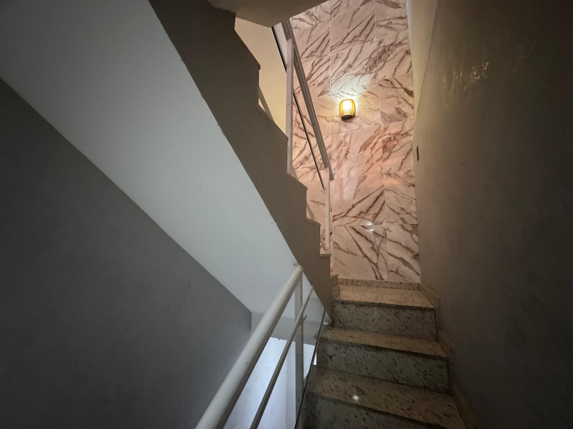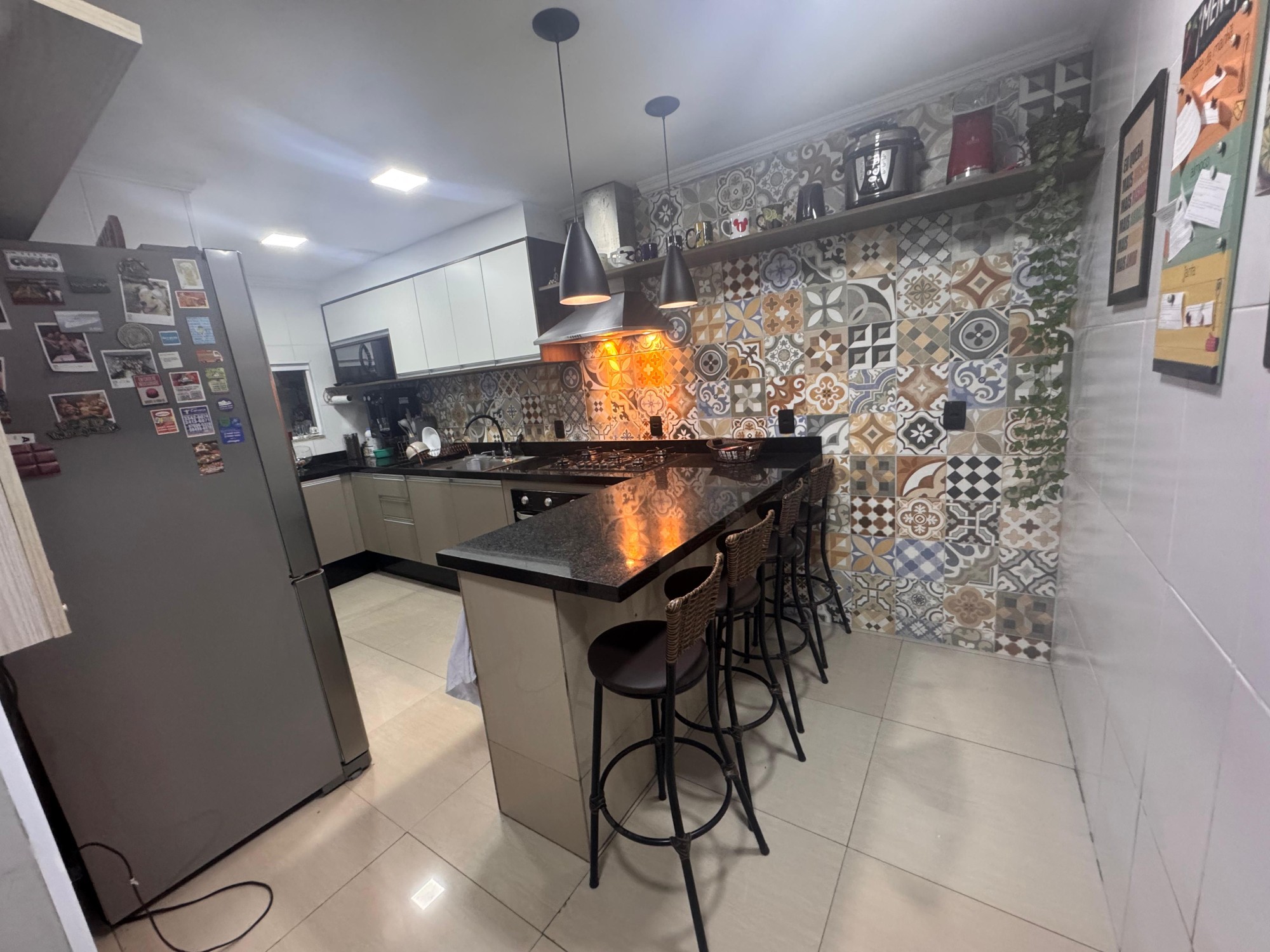 Ambiente sofisticado e funcional com acabamento em granito, iluminação suspensa e design moderno para receber com elegância.