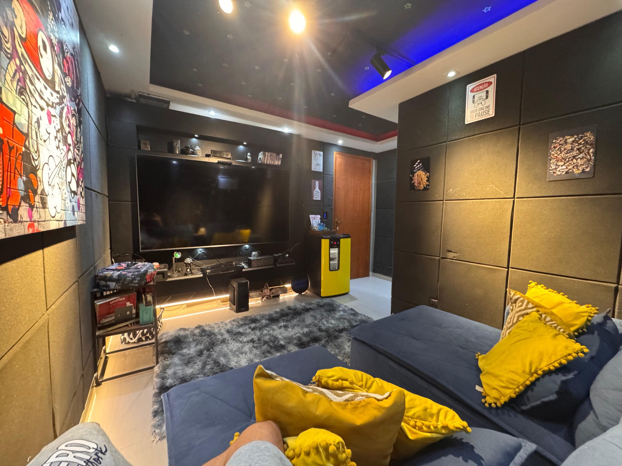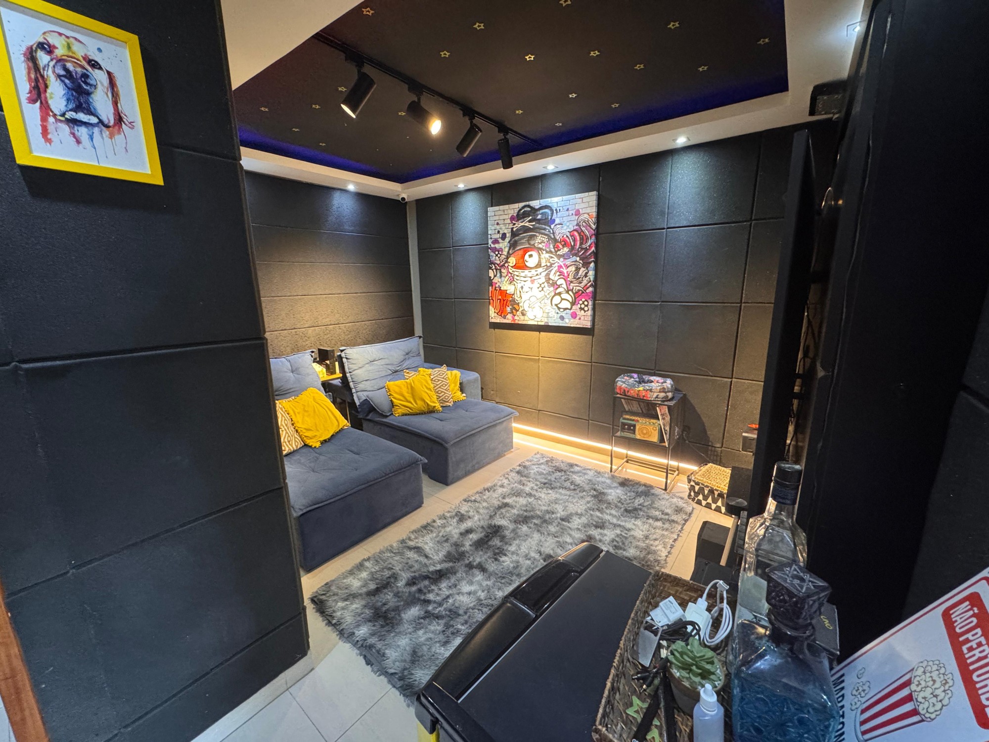 Totalmente projetado com isolamento acústico, iluminação cênica, poltronas reclináveis e decoração estilosa. Um verdadeiro cinema em casa.