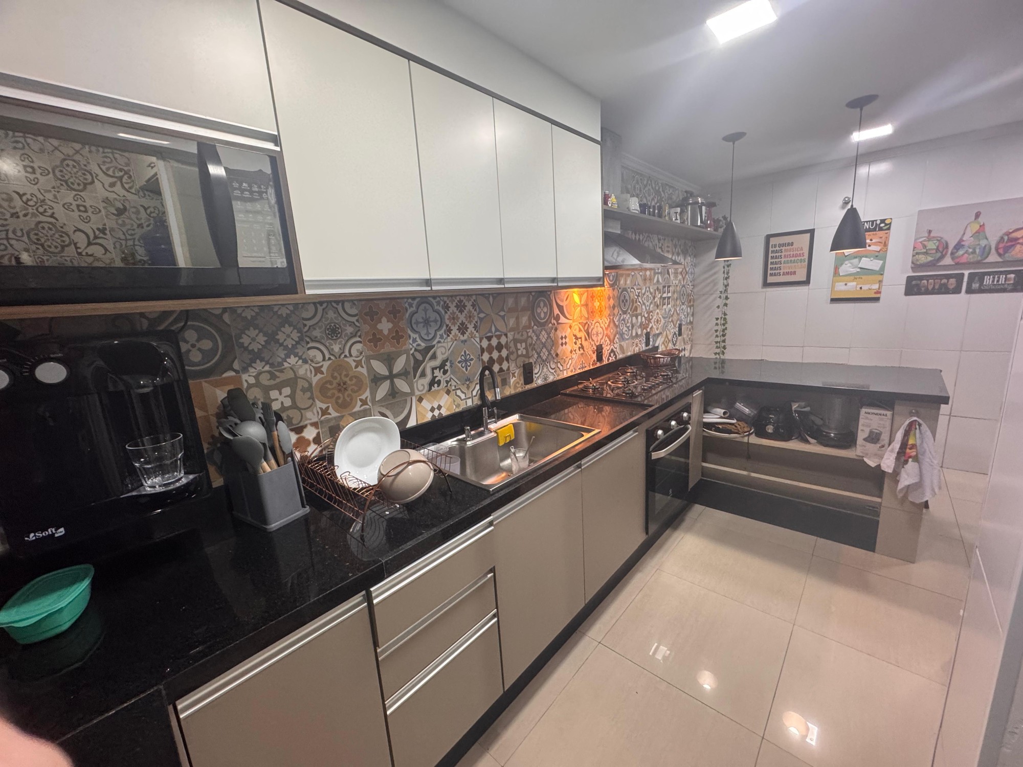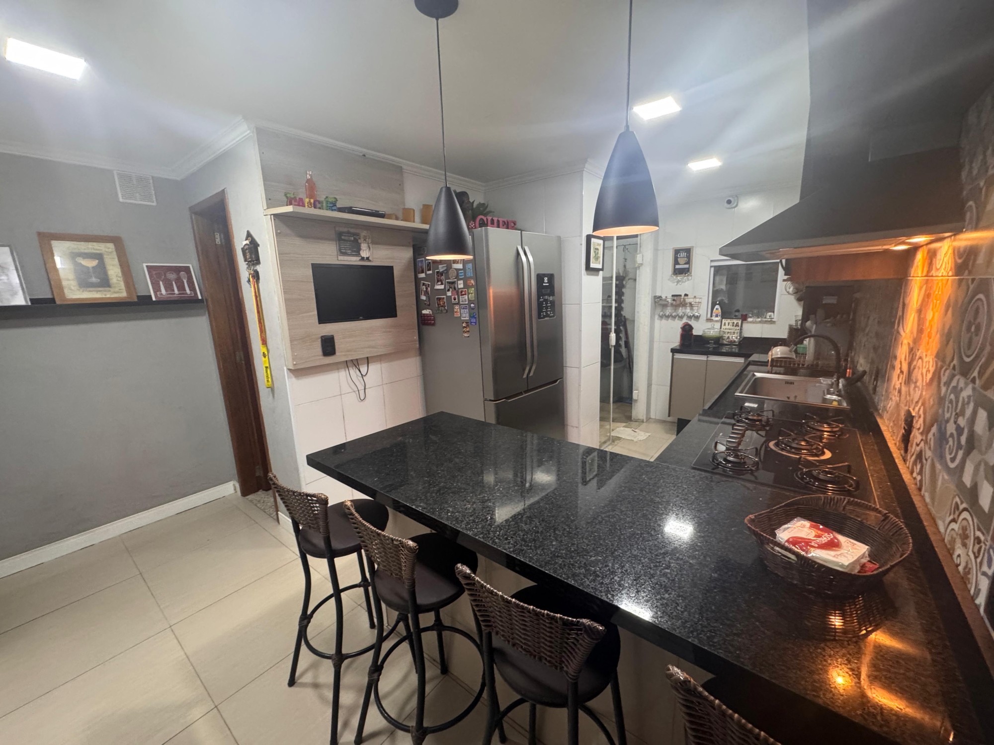 Ambiente sofisticado e funcional com acabamento em granito, iluminação suspensa e design moderno para receber com elegância.